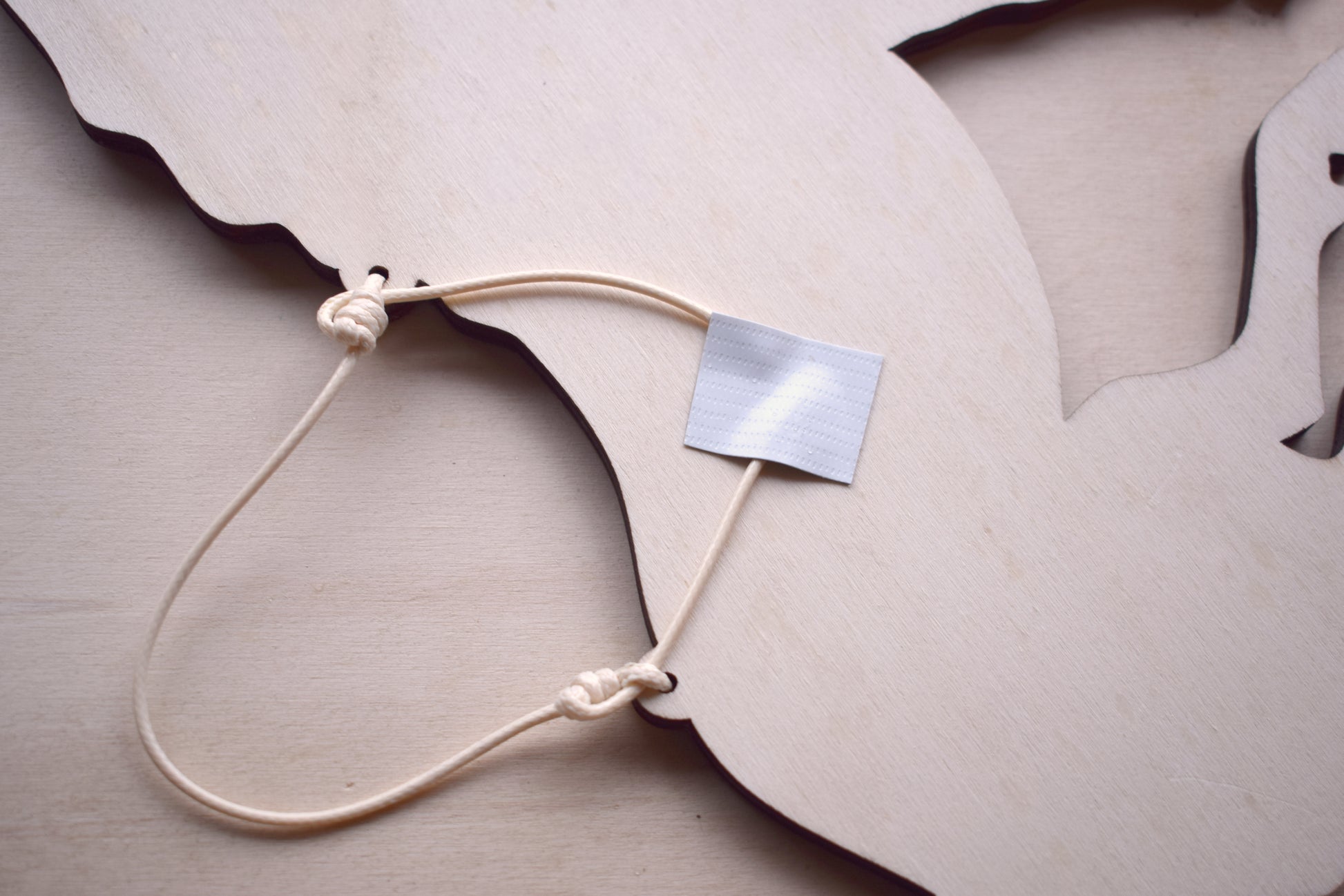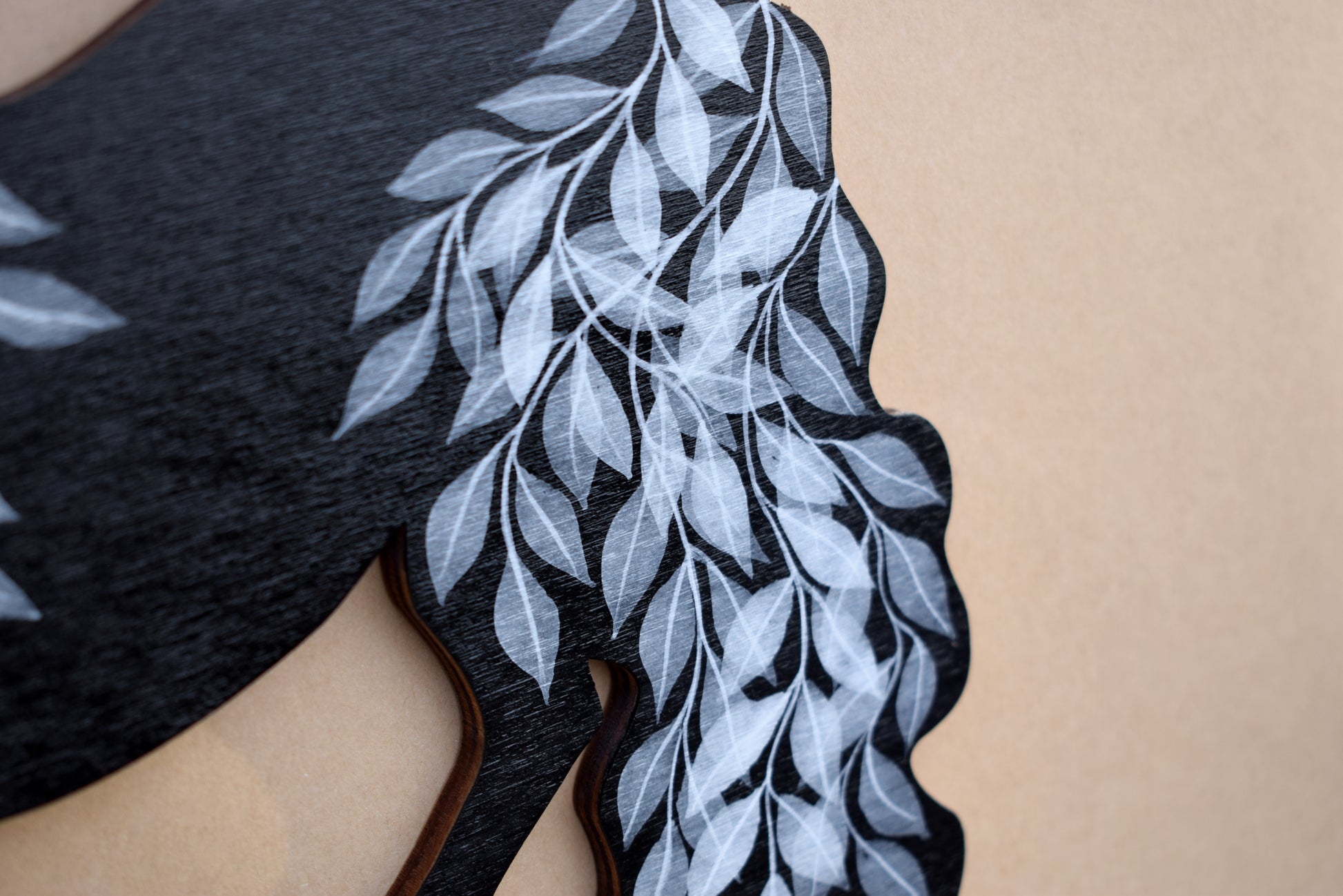 A handcrafted wooden horse hanging. Made from poplar plywood. Finished in a black stain and accented with soft white painted leaves. Hangs from a pale cream cord. The ends of the cord are neatly tucked in and secured with tape on the back to stop them peeking out the sides. You won't get the exact one in the picture, but it will be very similar, just not exactly the same as they are hand-stained and painted.