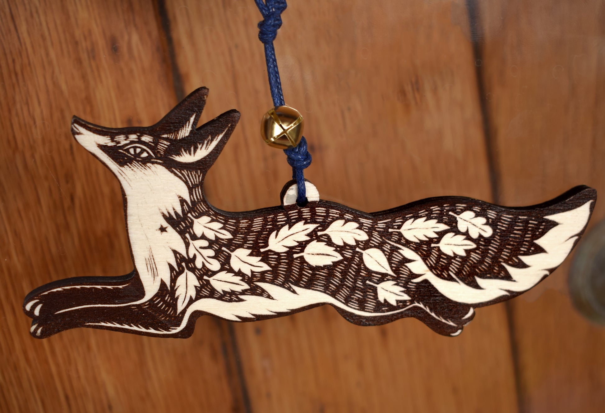 A little Fox ornament with leaves and a jingle bell