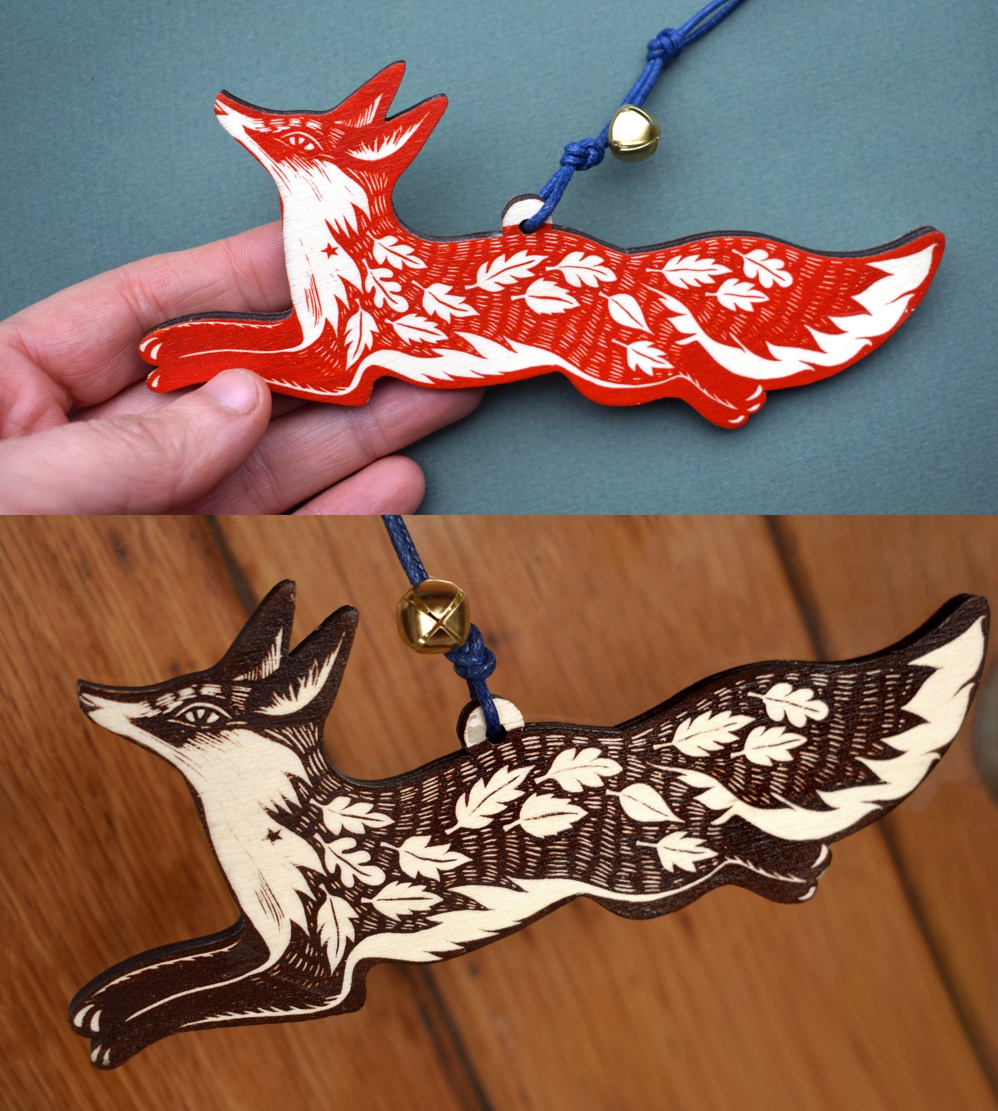 Small Leafy fox - screen print on wood ornament, in red or brown