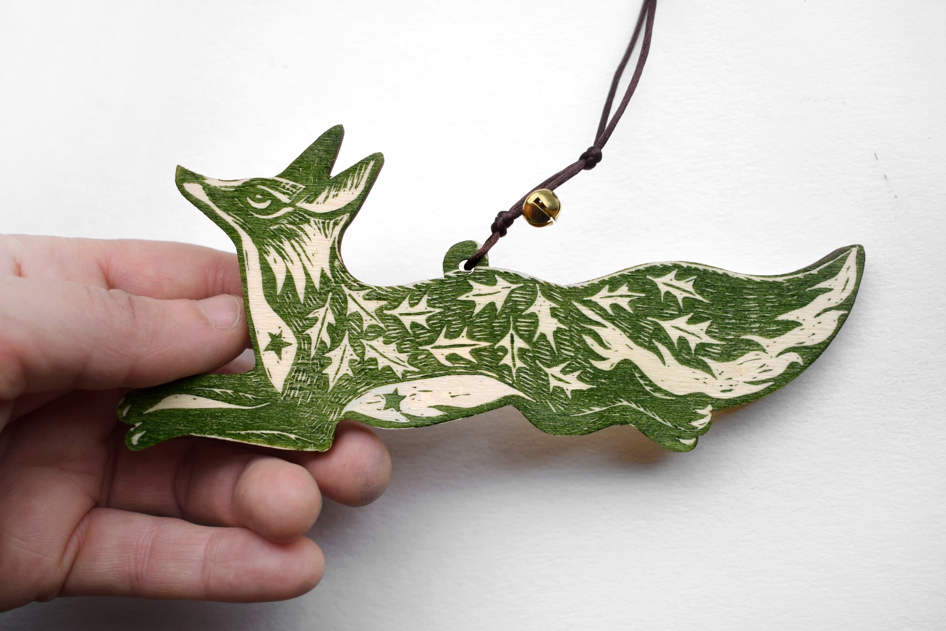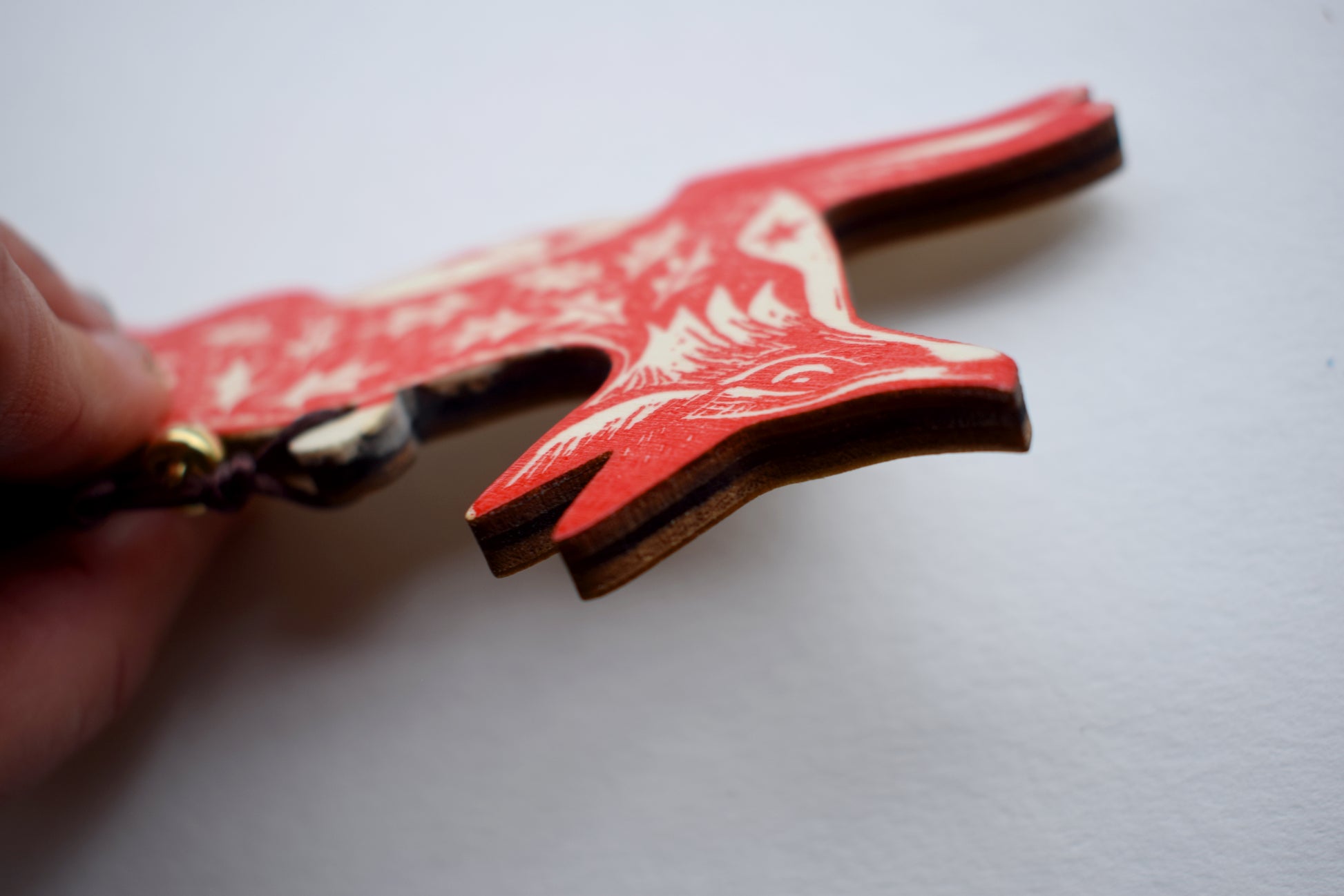 Lino print on wood. 15cm wide. Wood is 6mm thick. Acrylic ink sealed with lacquer. With a brown ribbon and bell. Being hand printed, there will be some variation.