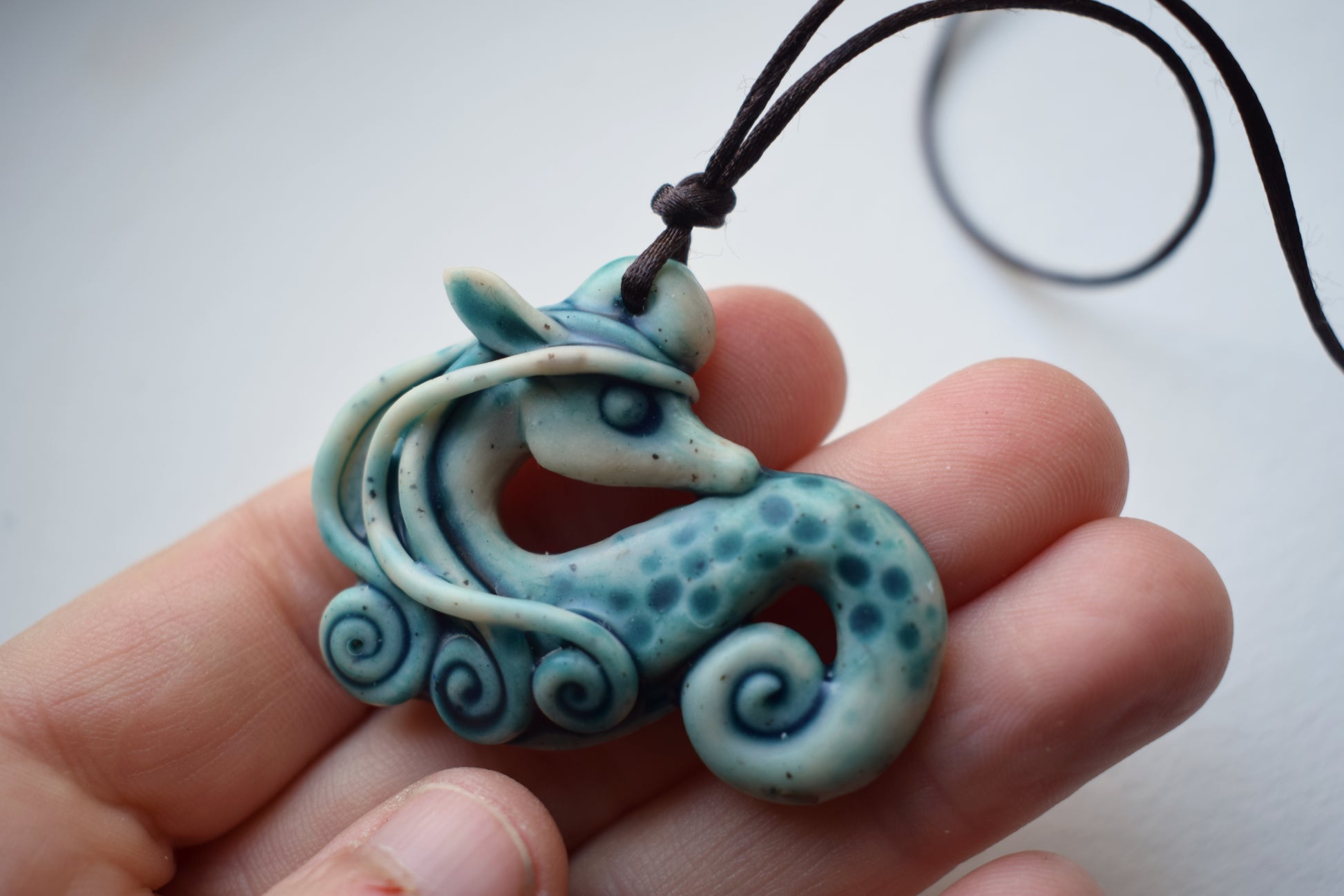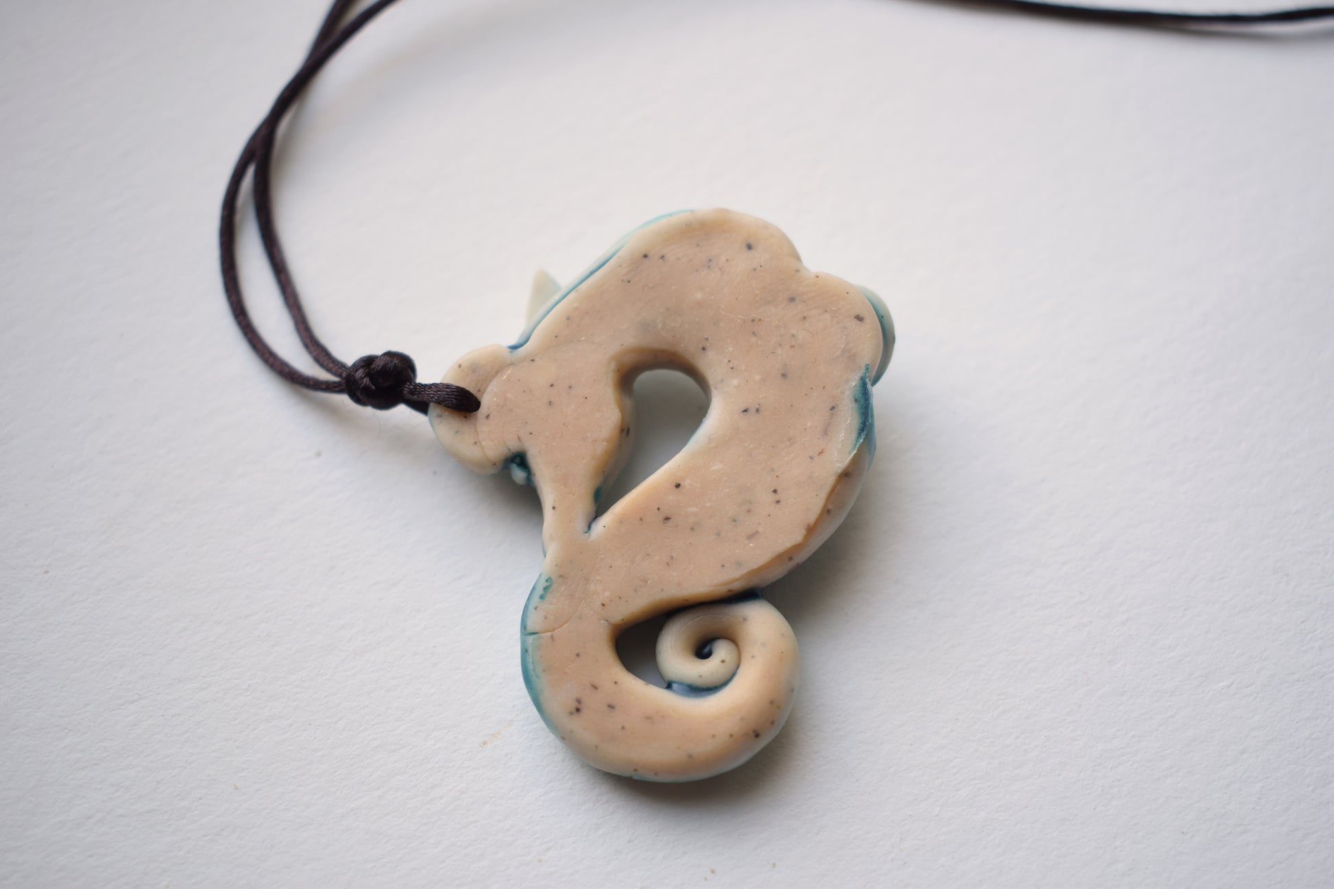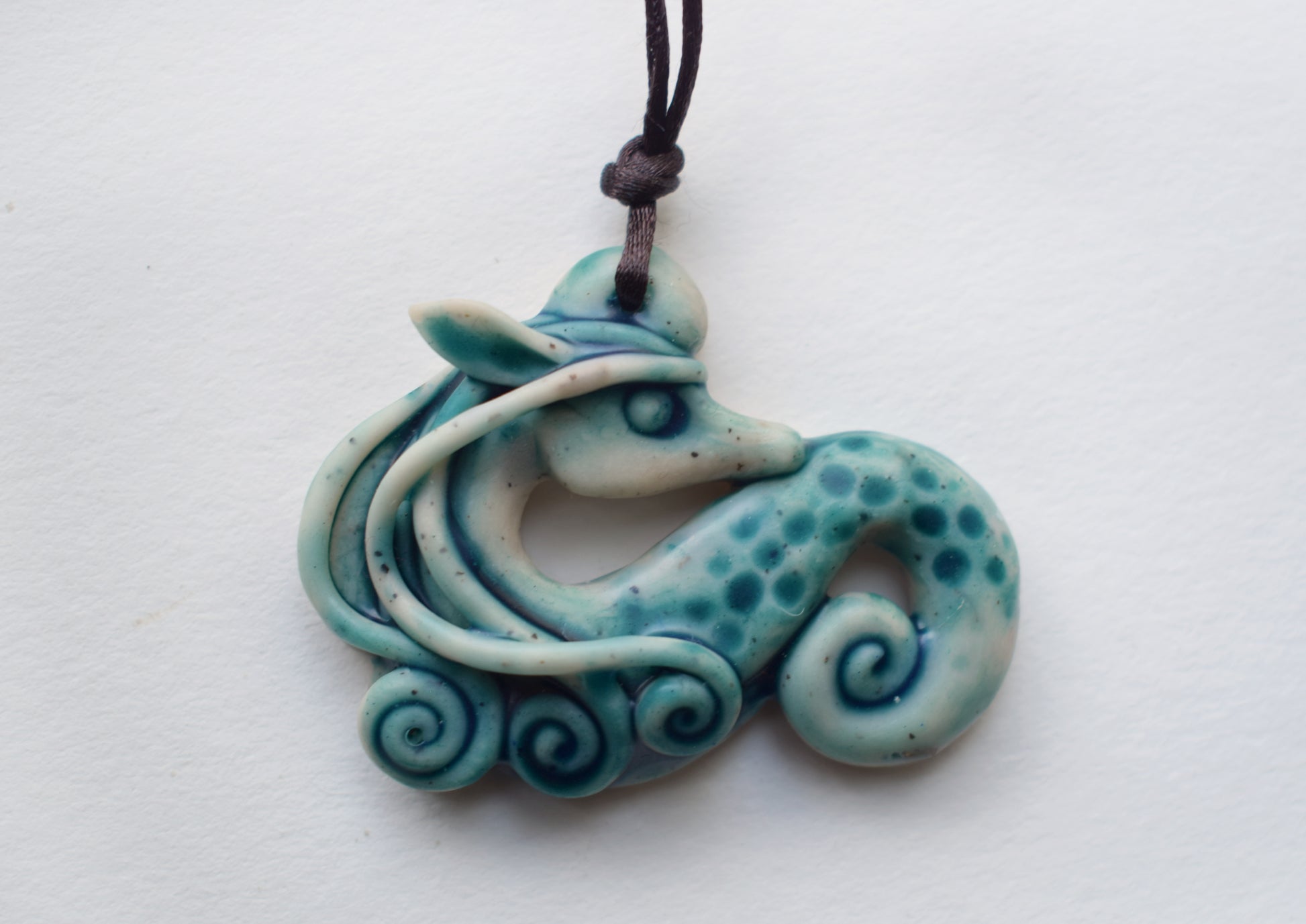 A hand-made kelpie pendant necklace sculpted from polymer clay. Not ceramic - polymer clay is a sculptural plastic, it feels different and is very strong and slightly flexible. The clay is pale beige/grey with speckles, and a dark blue-green glaze effect on top. They are all unique wearable artworks, individually handmade, and will each be slightly different.