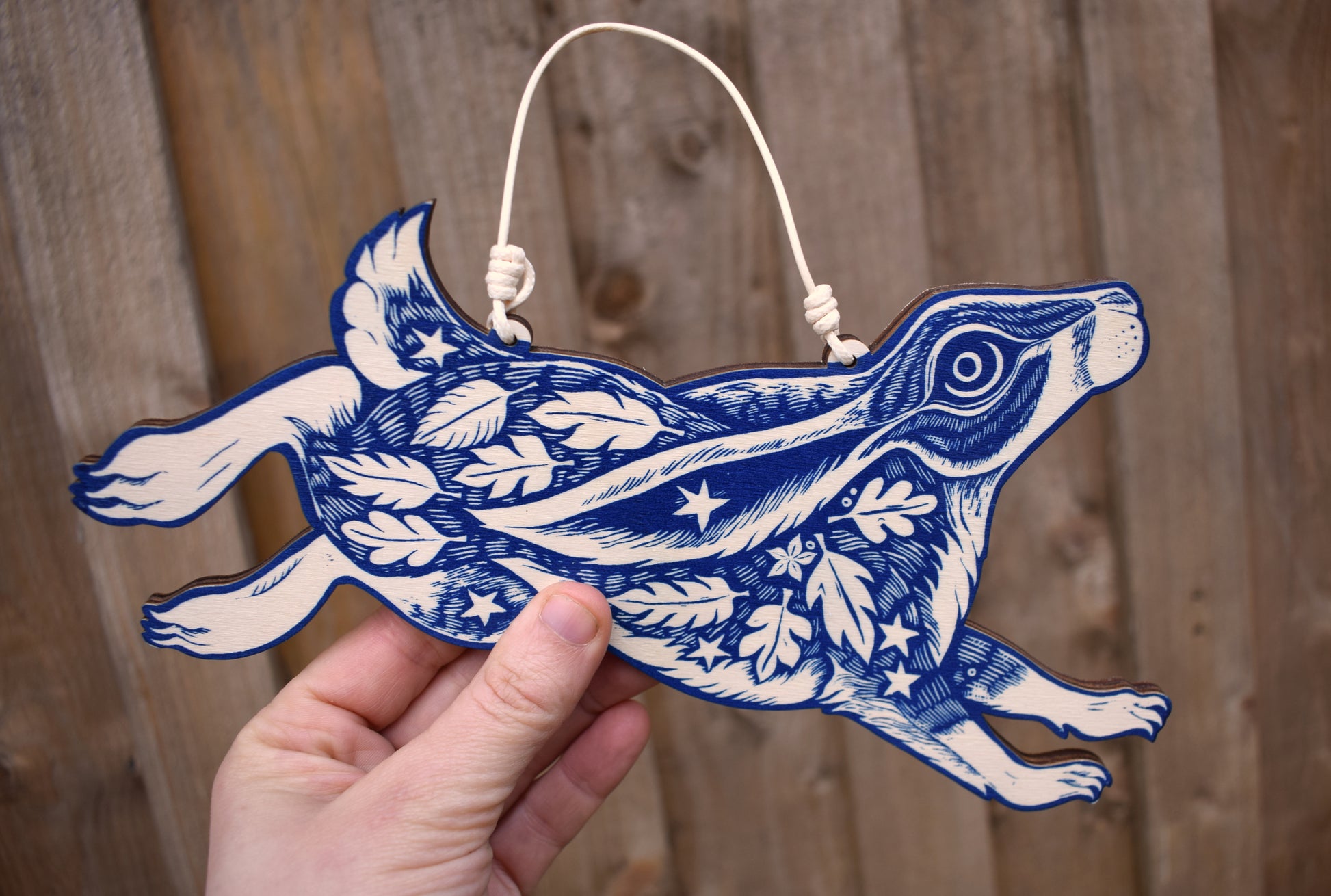 A wooden hare, screen printed in deep blue ink. 23 cm wide as it hangs in the picture, and 6mm thick.
