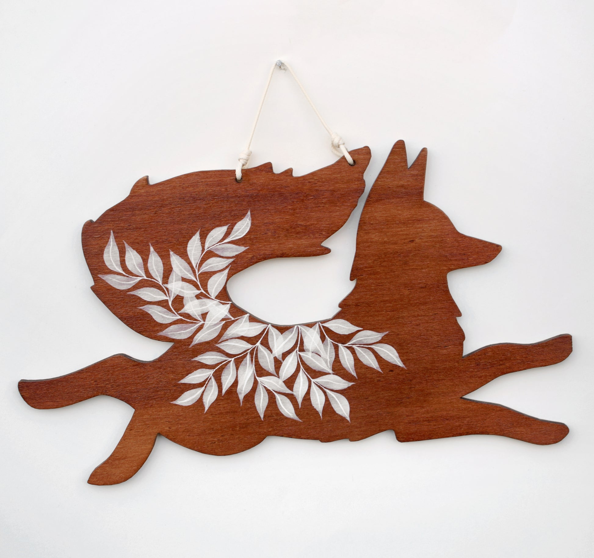 A handcrafted wooden fox hanging. Made from poplar plywood. Finished in a reddish brown stain and accented with soft white painted leaves. Hangs from a whit cotton cord. The ends of the cord are neatly tucked in and secured with tape on the back to stop them peeking out the sides. You won't get the exact one in the picture, but it will be very similar, just not exactly the same as they are hand-stained and painted.