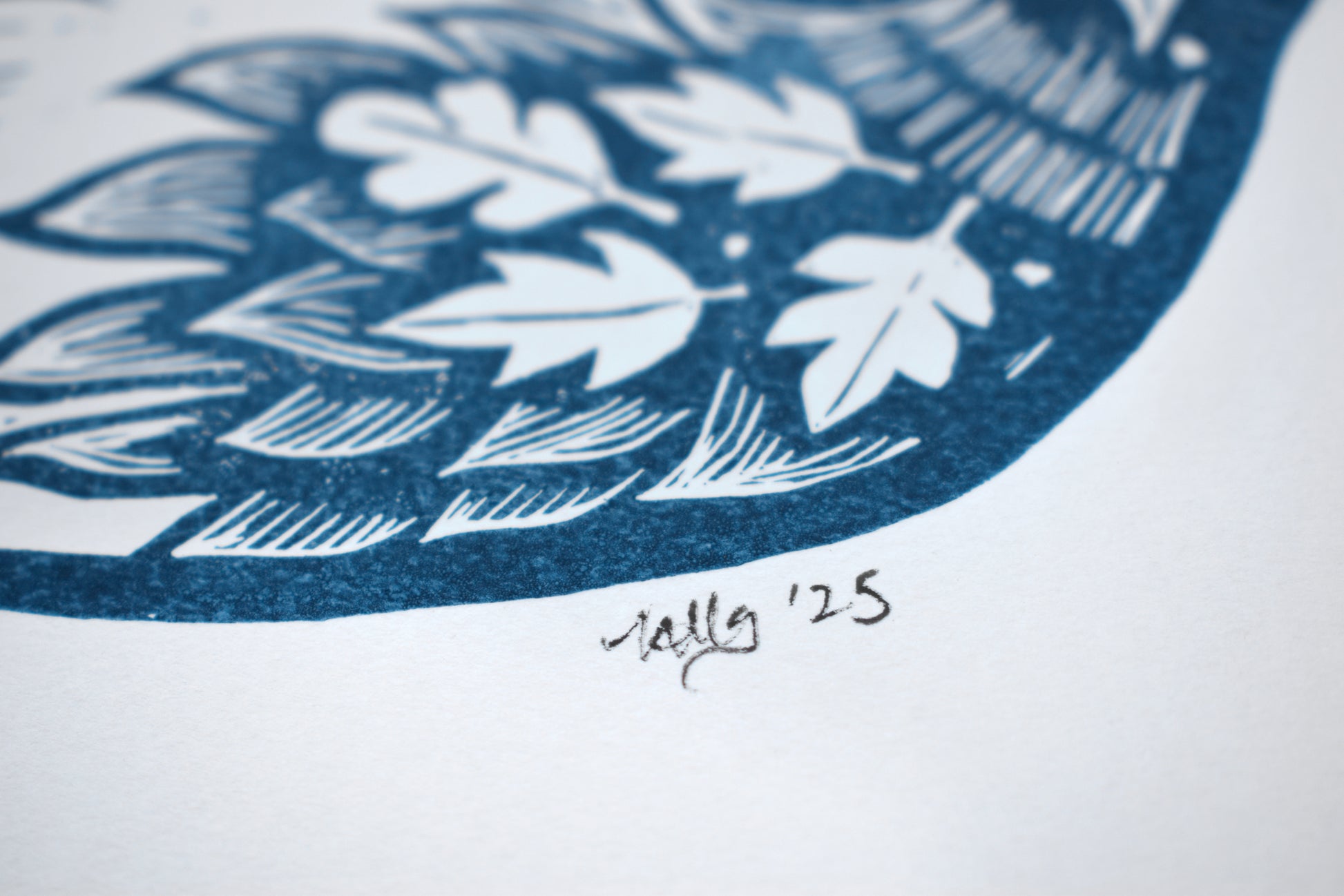 Ready to frame or display as you wish. The paper has a soft, lightly textured surface that complements the organic nature of the lino print.