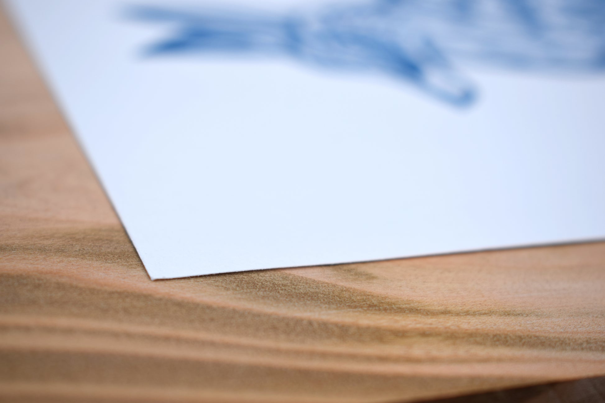 A hand-printed lino cut of a fox, printed in rich deep blue ink on 10 by 8 inch Strathmore 120gsm printmaking paper. Each print is individually inked and pressed by hand, giving every piece its own slight variations and character.