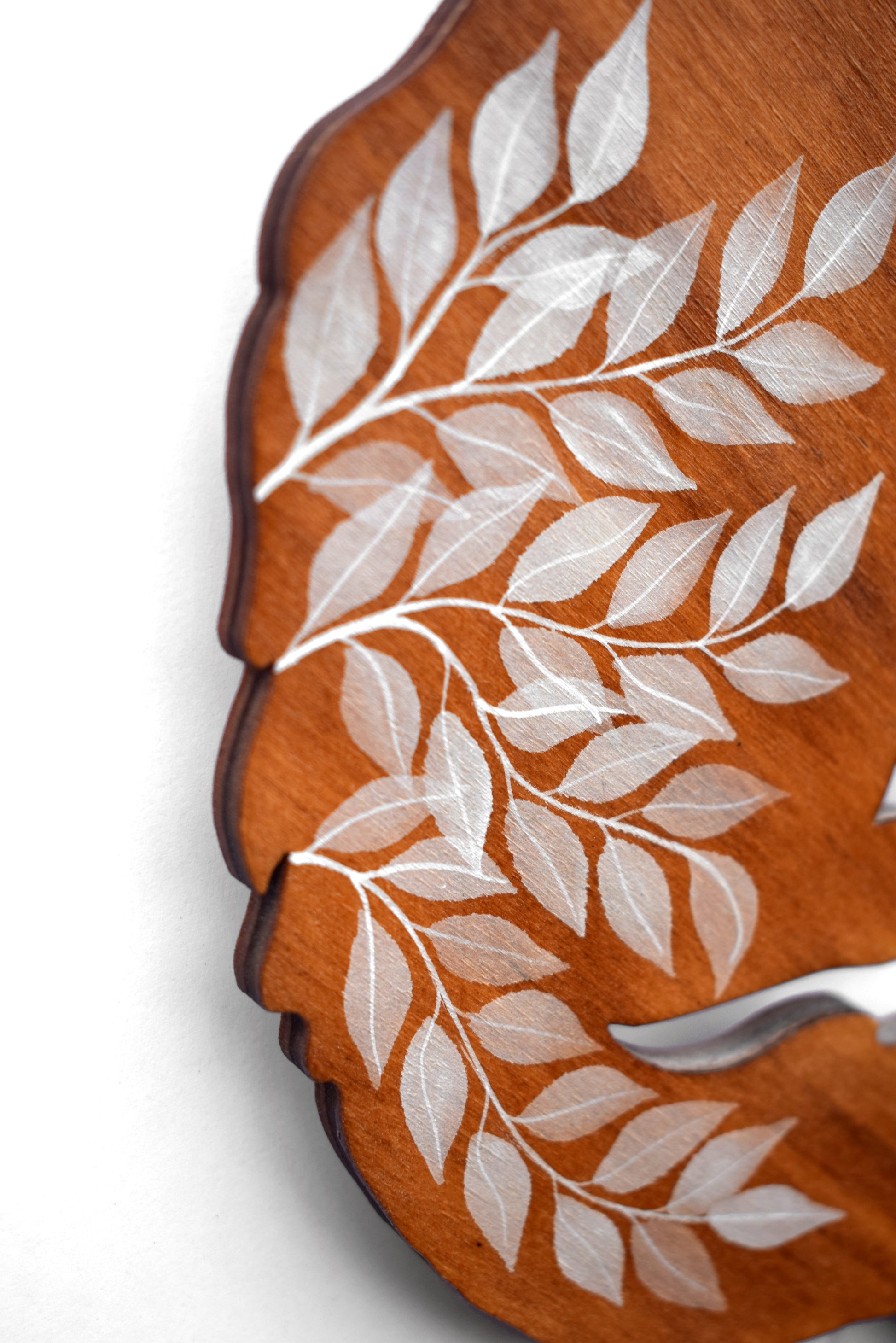 A handcrafted wooden cat hanging. Made from Birch and Beech plywood. Finished in a rich deep golden-brown stain and accented with soft white painted leaves. A rear-mounted wooden panel with a D-ring fixing creates a slight floating effect when hung. You will not get the exact one in the picture, but one extremely similar with small differences due to being hand painted.