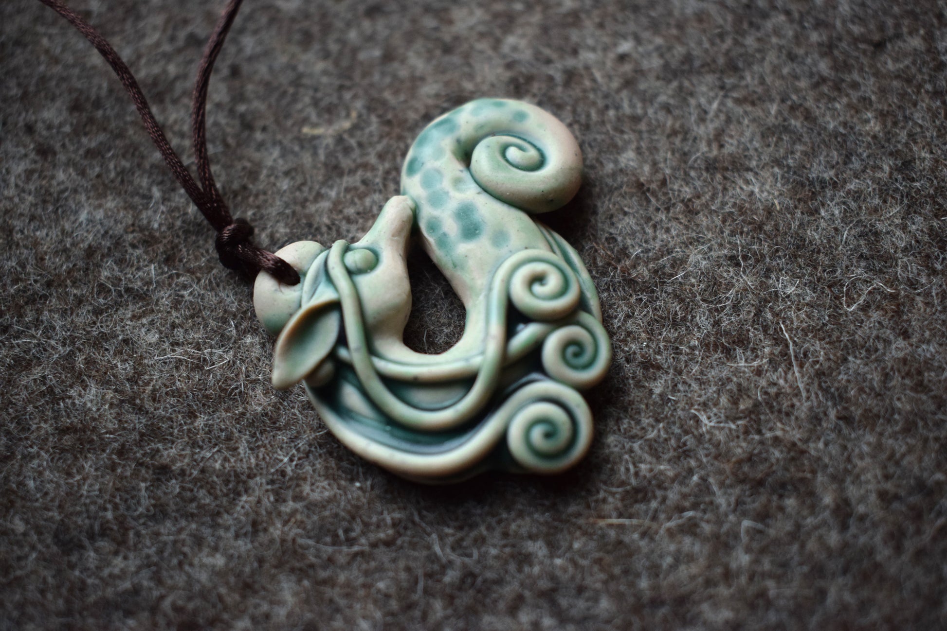 A hand-made kelpie pendant necklace sculpted from polymer clay. You will not get the exact one in the picture, but one very similar, with small differences due to being handmade.