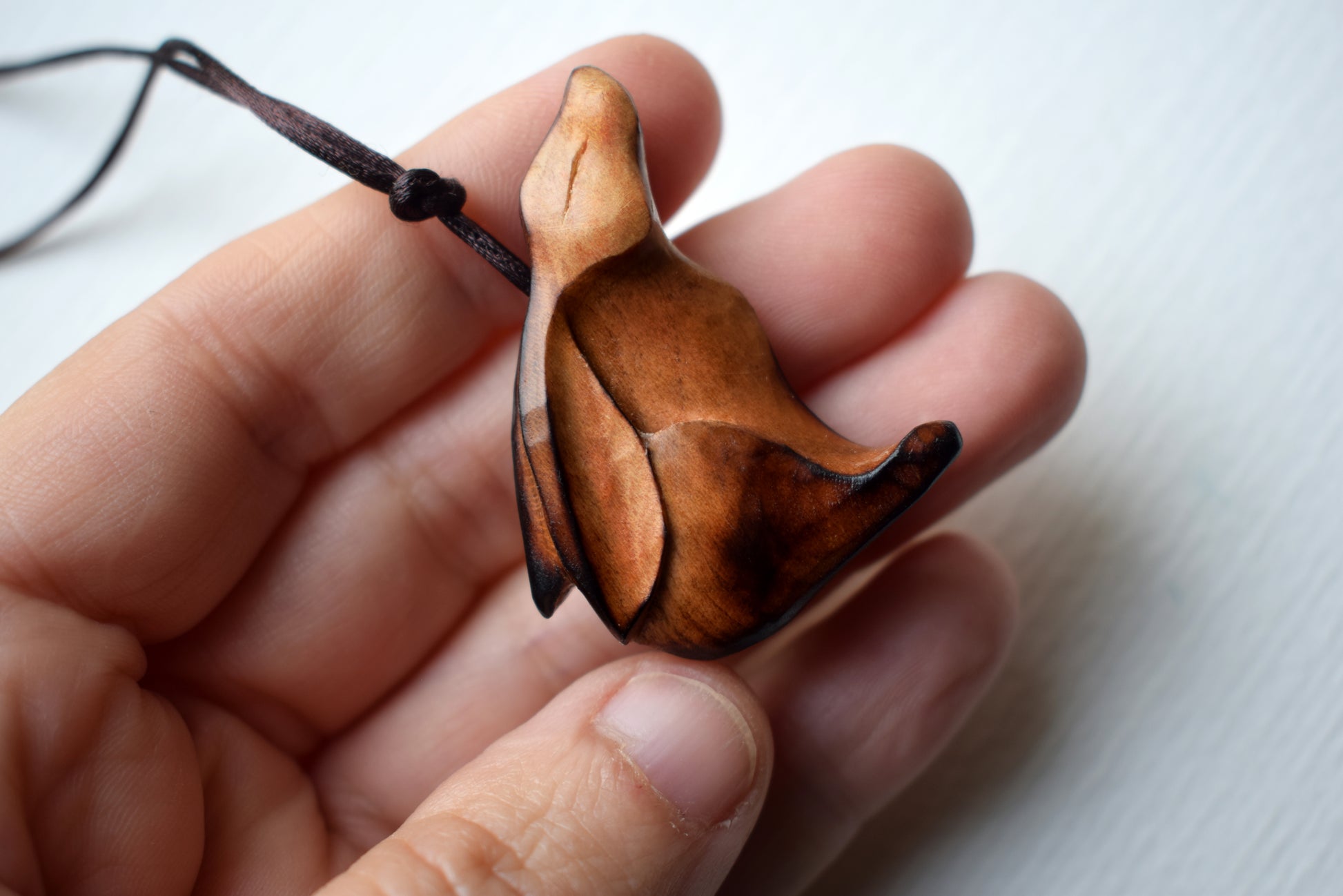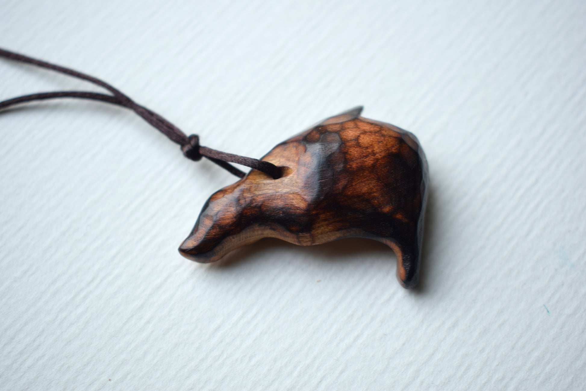 A hand-made moon gazing hare pendant that I carved from cherry wood, finished with wax. Water resistant but try not to get it wet.