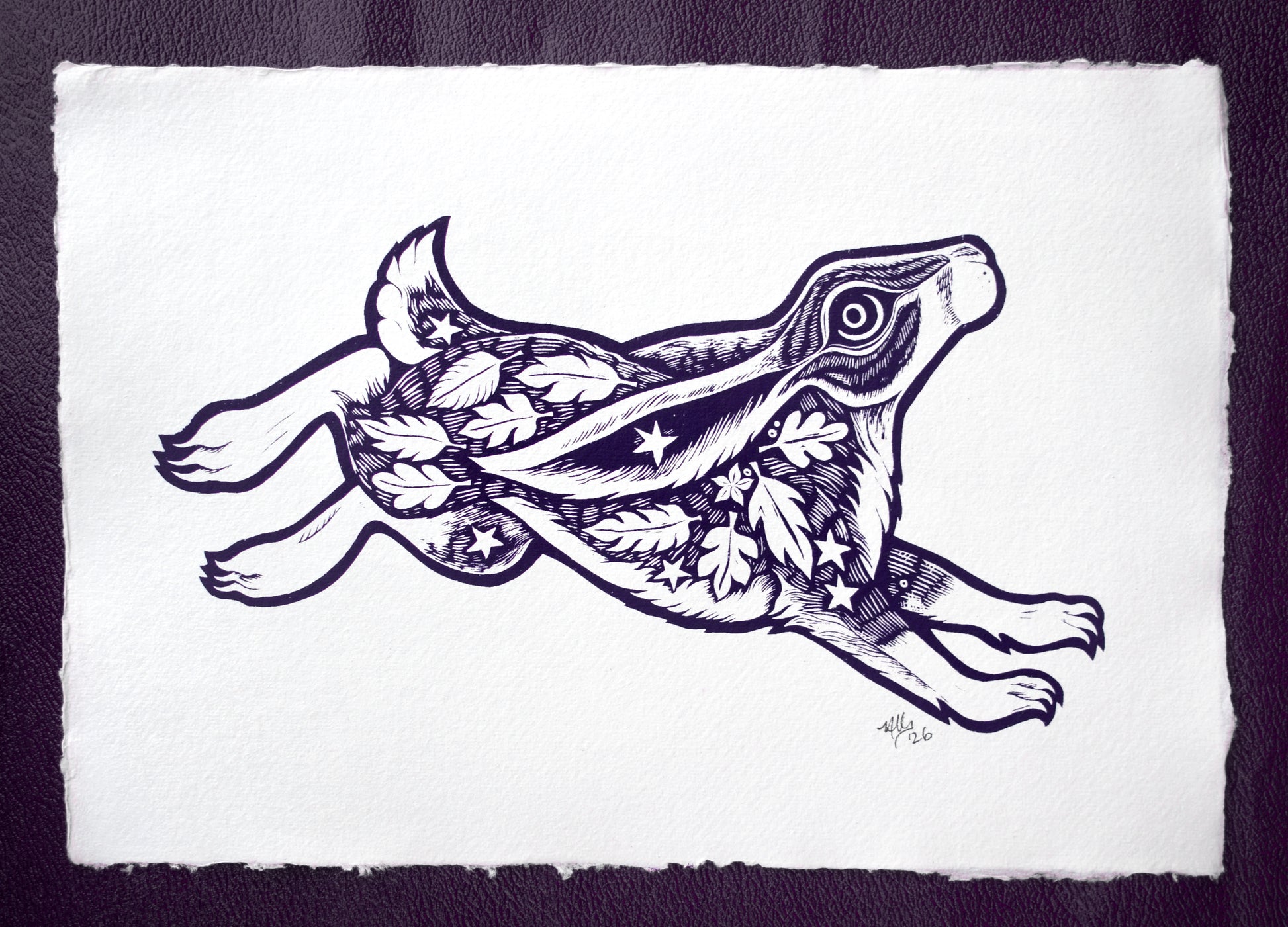 A hand-printed screenprint of a hare, printed on textured 150gsm Khadi cotton rag paper. Each print has own slight variations and character due to being hand printed. A4 size, with deckled (torn) edges. The purple is very dark, almost black.