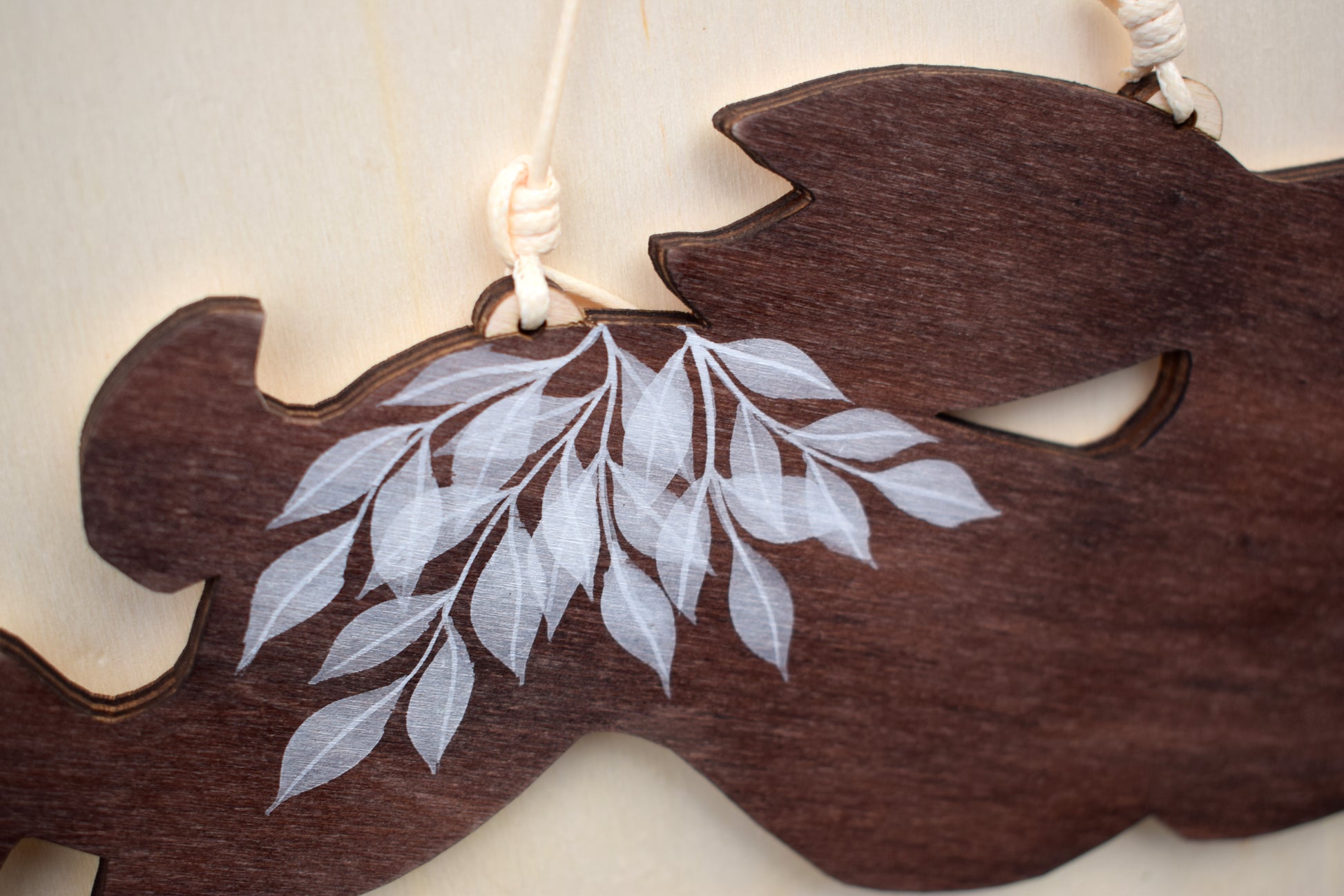 A handcrafted wooden hare wall hanging. Made from poplar plywood. Finished in a rich deep brown stain and accented with soft white painted leaves. Hangs from a pale cream cord. The ends of the cord are neatly tucked in and secured with tape on the back to stop them peeking out the sides. You won't get the exact one in the picture, but it will be very similar, just not exactly the same as they are hand-stained and painted.