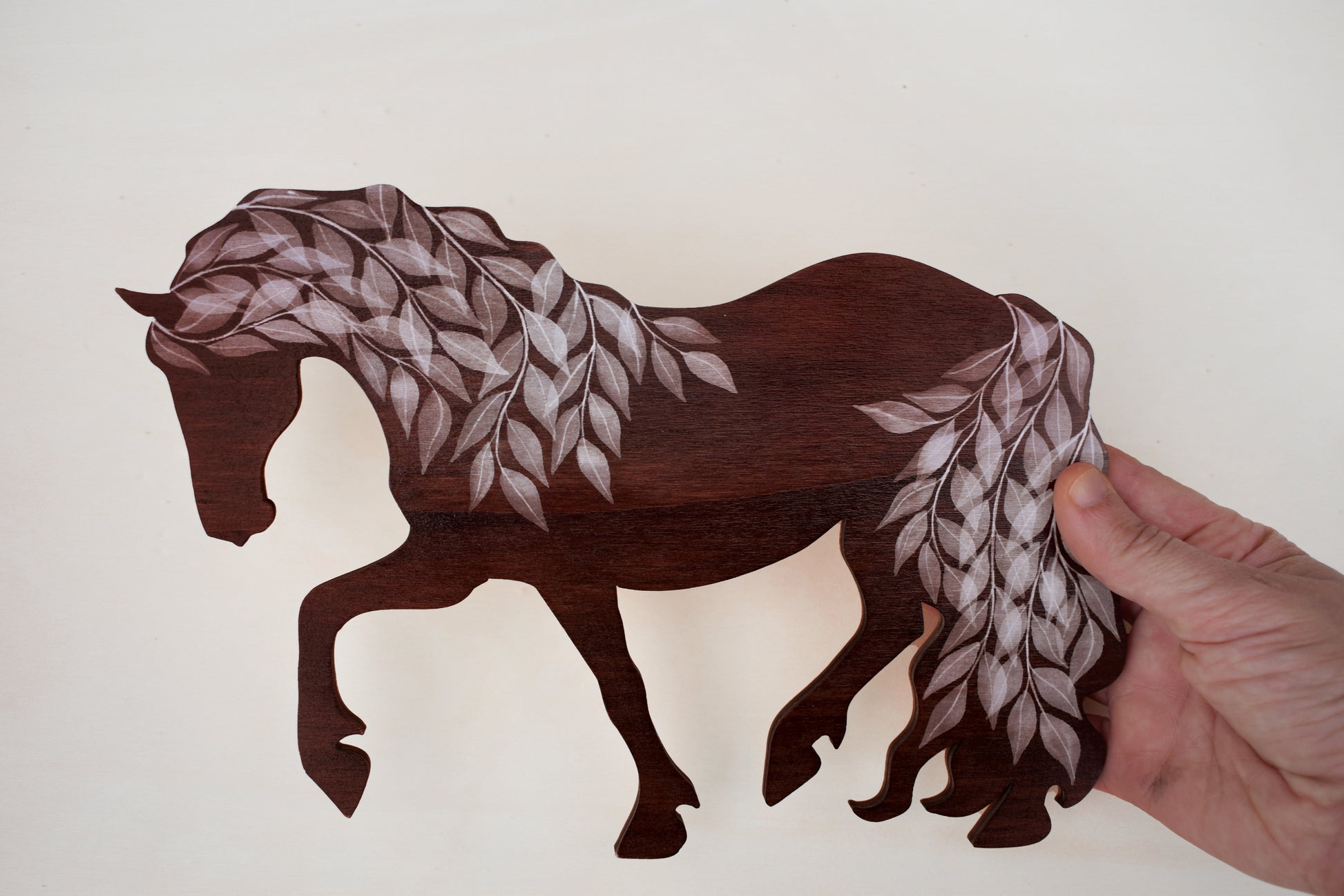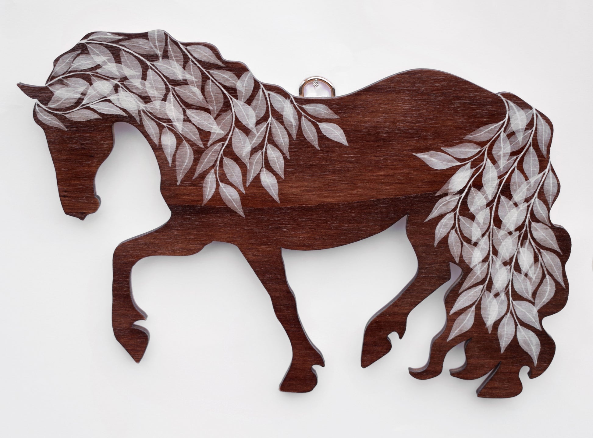 A handcrafted wooden horse hanging. Made from Birch and Beech plywood. Finished in a rich deep brown stain and accented with soft white painted leaves. A rear-mounted wooden panel with a D-ring fixing creates a slight floating effect when hung. You won't get the exact one in the picture, but it will be very similar, just not exactly the same as they are hand-stained and painted.