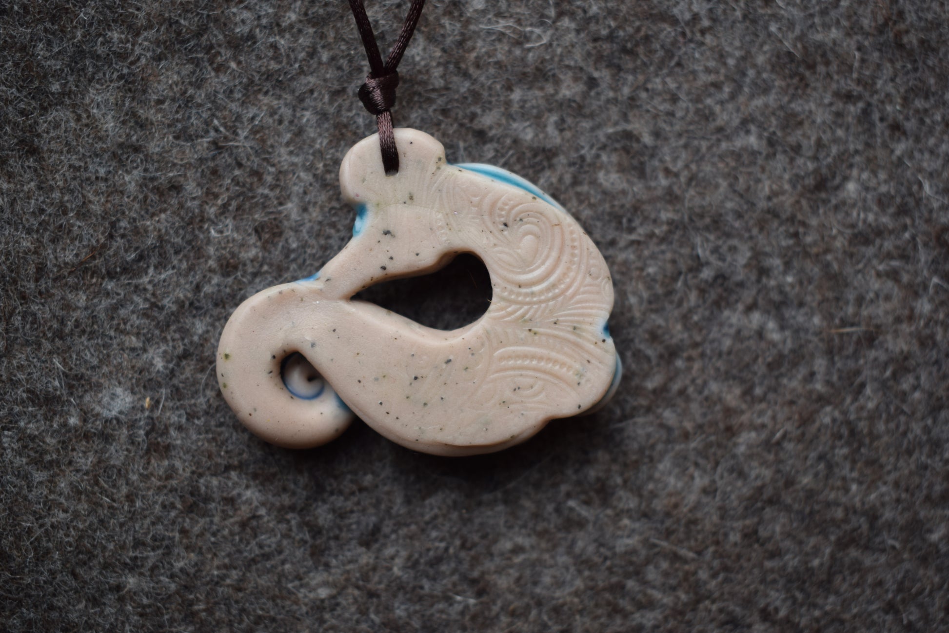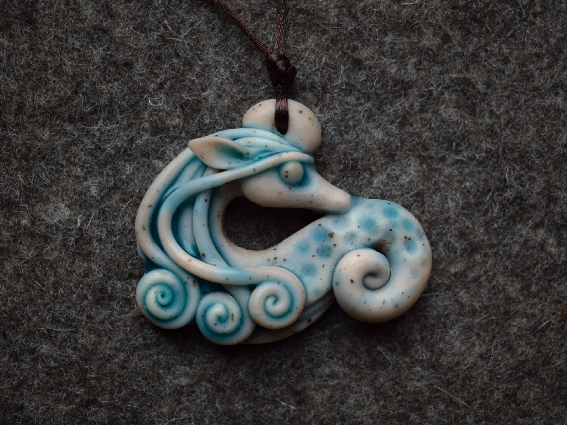 A hand-made kelpie pendant necklace sculpted from polymer clay. You will not get the exact one in the picture, but one very similar, with small differences due to being handmade.