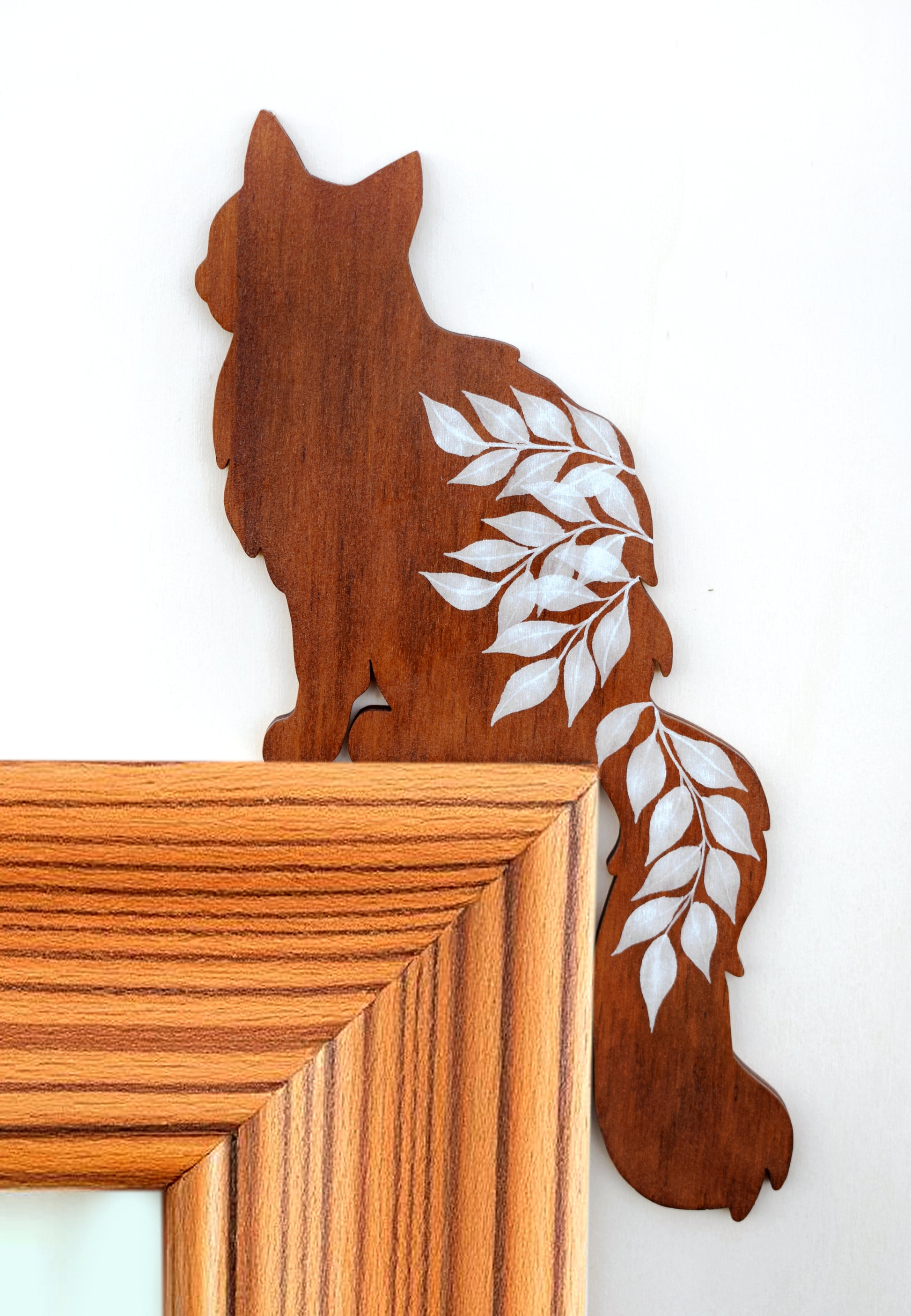 A wooden cat door topper. It is approx 27cm tall and 6mm thick. Stained orangey brown on one side and natural pale wood on the other with painted white leaves. Designed to sit upright on the corner of a door frame. Available for left or right corner (your left or right as you stand facing the door).