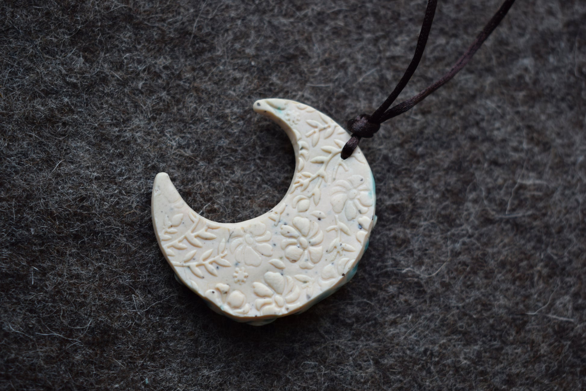 A hand-made moon pendant necklace sculpted from polymer clay. Not ceramic - polymer clay is a sculptural plastic, it feels different and is very strong and slightly flexible. You won't get the exact one in the picture, but one extremely similar with small differences due to being handmade - they are all unique wearable artworks, individually handmade, and will each be slightly different.