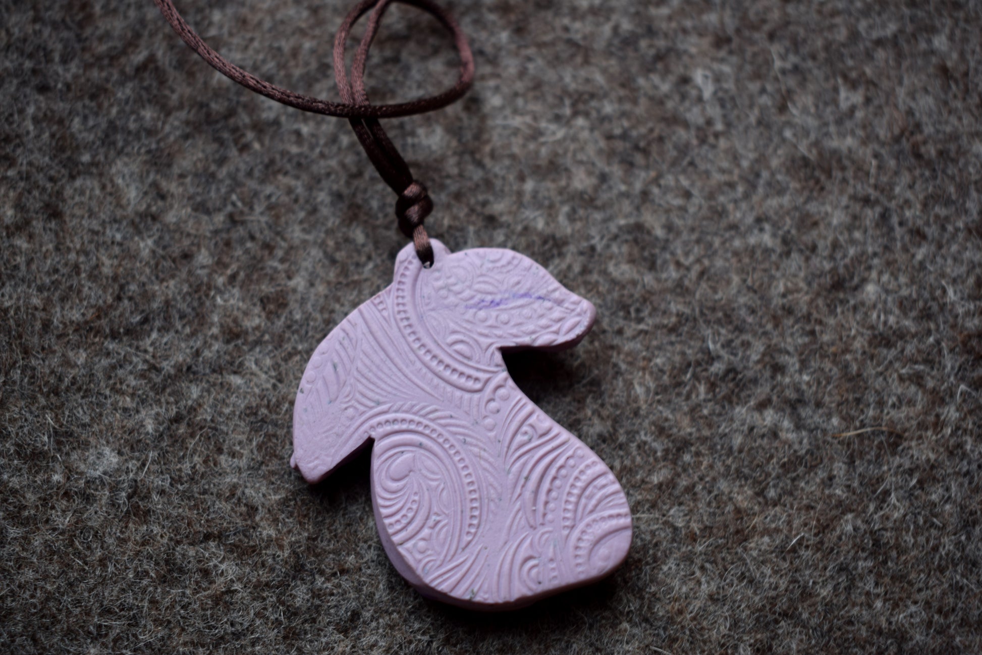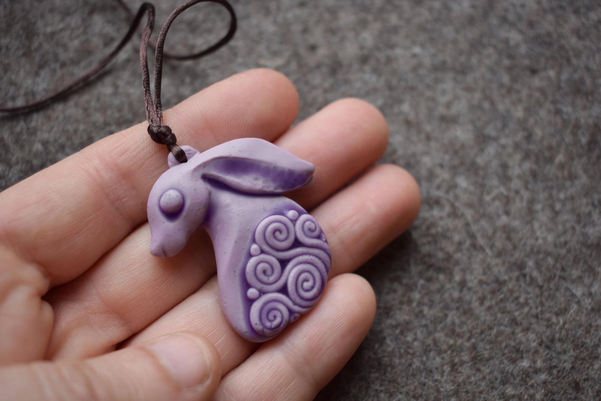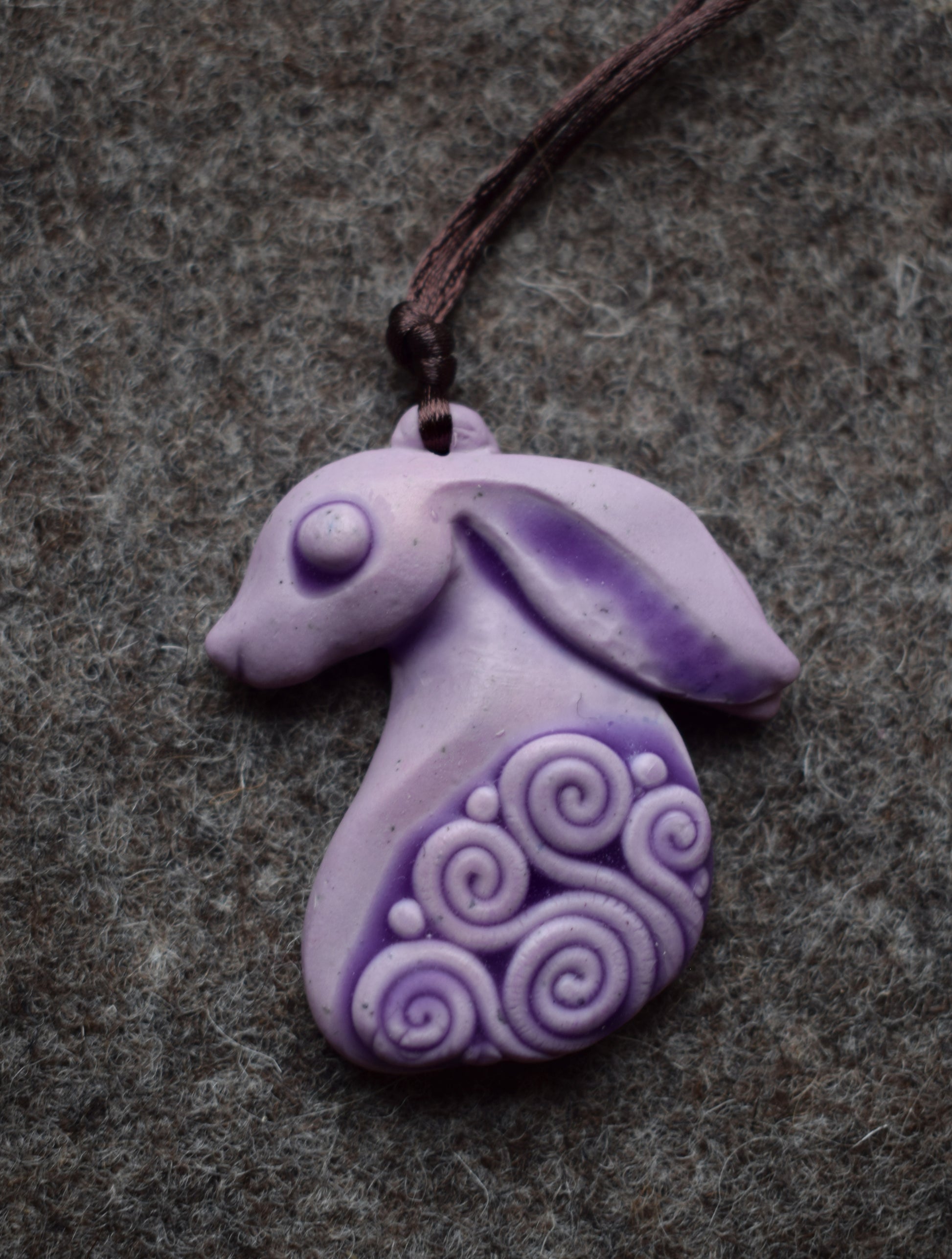 A hand-made hare pendant necklace sculpted from polymer clay. Not ceramic - polymer clay is a sculptural plastic, it feels different and is very strong and slightly flexible. The clay is pale purple with speckles, and a purple glaze effect on top. You will not get the specific one pictured - they are all very similar with small differences due to being handmade. The second photo shows the range of these subtle differences.