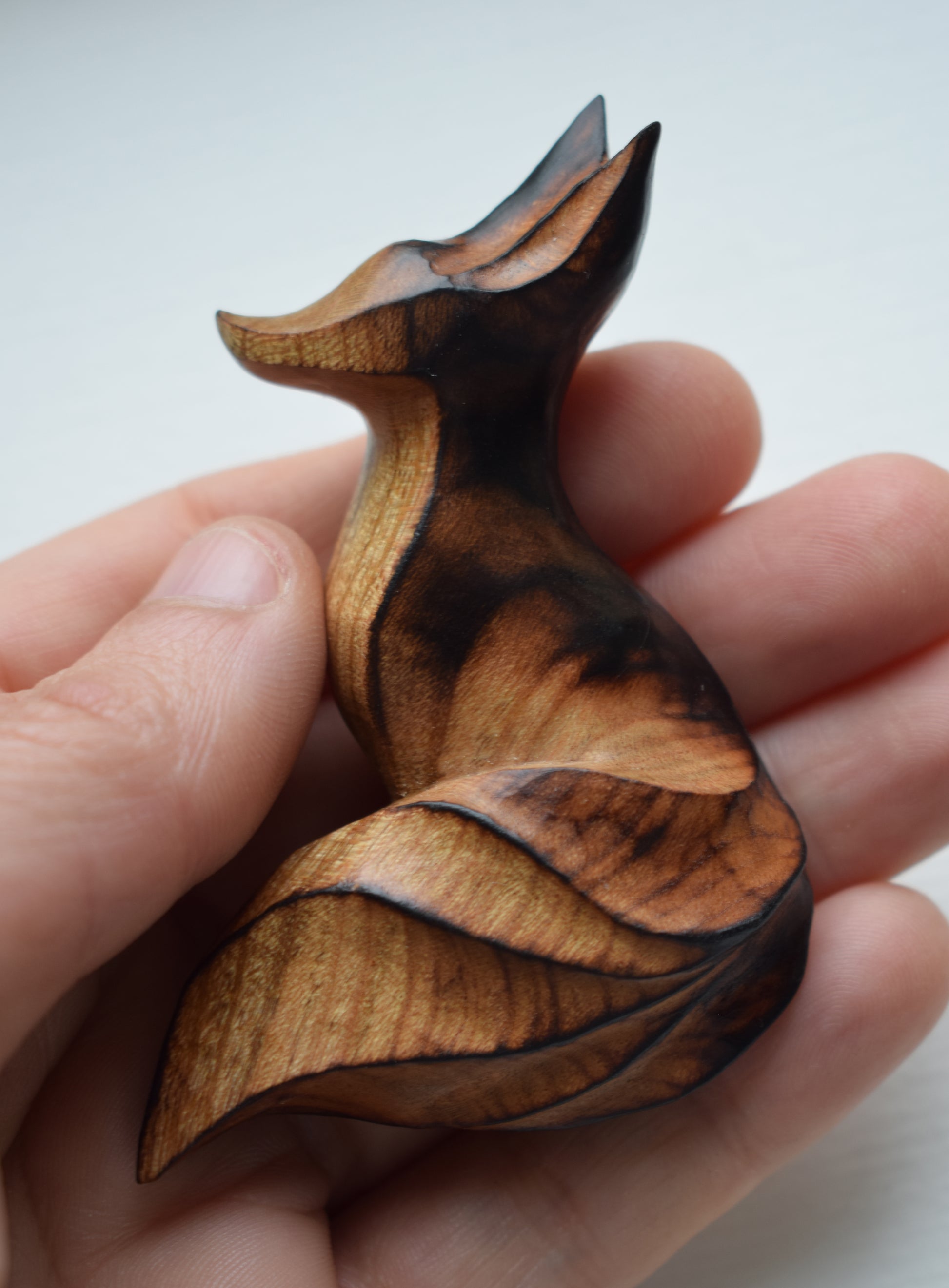 A hand-made fox stress pebble that I carved by hand from cherry wood, finished with hard wax oil. Mostly very smooth all over, except for some texturing in the tail which I left to provide sensory interest.