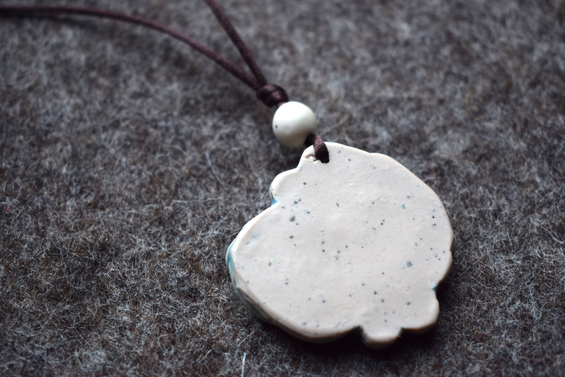 Not ceramic - polymer clay is a sculptural plastic, it feels different and is very strong and slightly flexible. The clay is grey-beige with speckles, and a blue-green glaze effect on top. This piece is made using a natural botanical speckle blend made from rooibos, caffeine-free green tea, and decaffeinated coffee. These ingredients have been simmered, dried, and finely powdered before being mixed into the clay. If you have sensitivities to plant materials or herbal products, please bear this in mind.