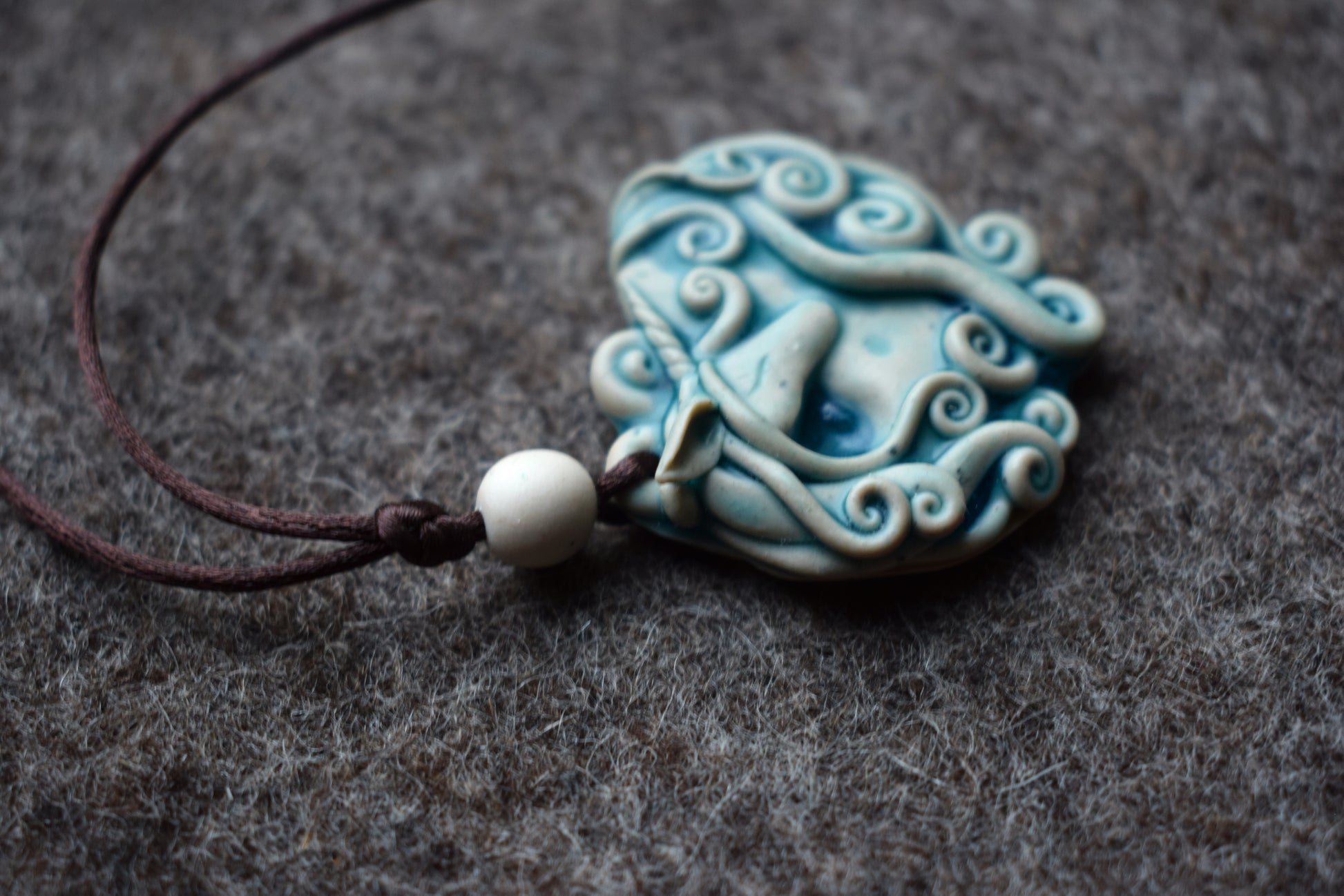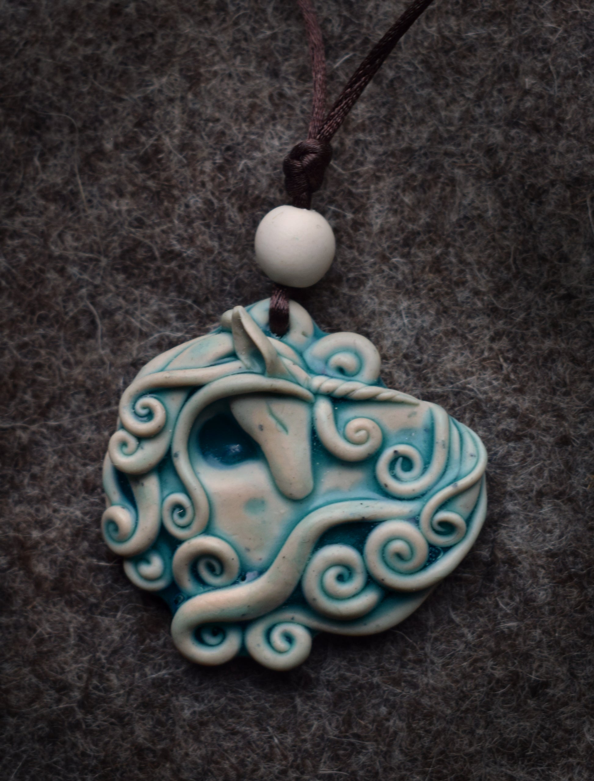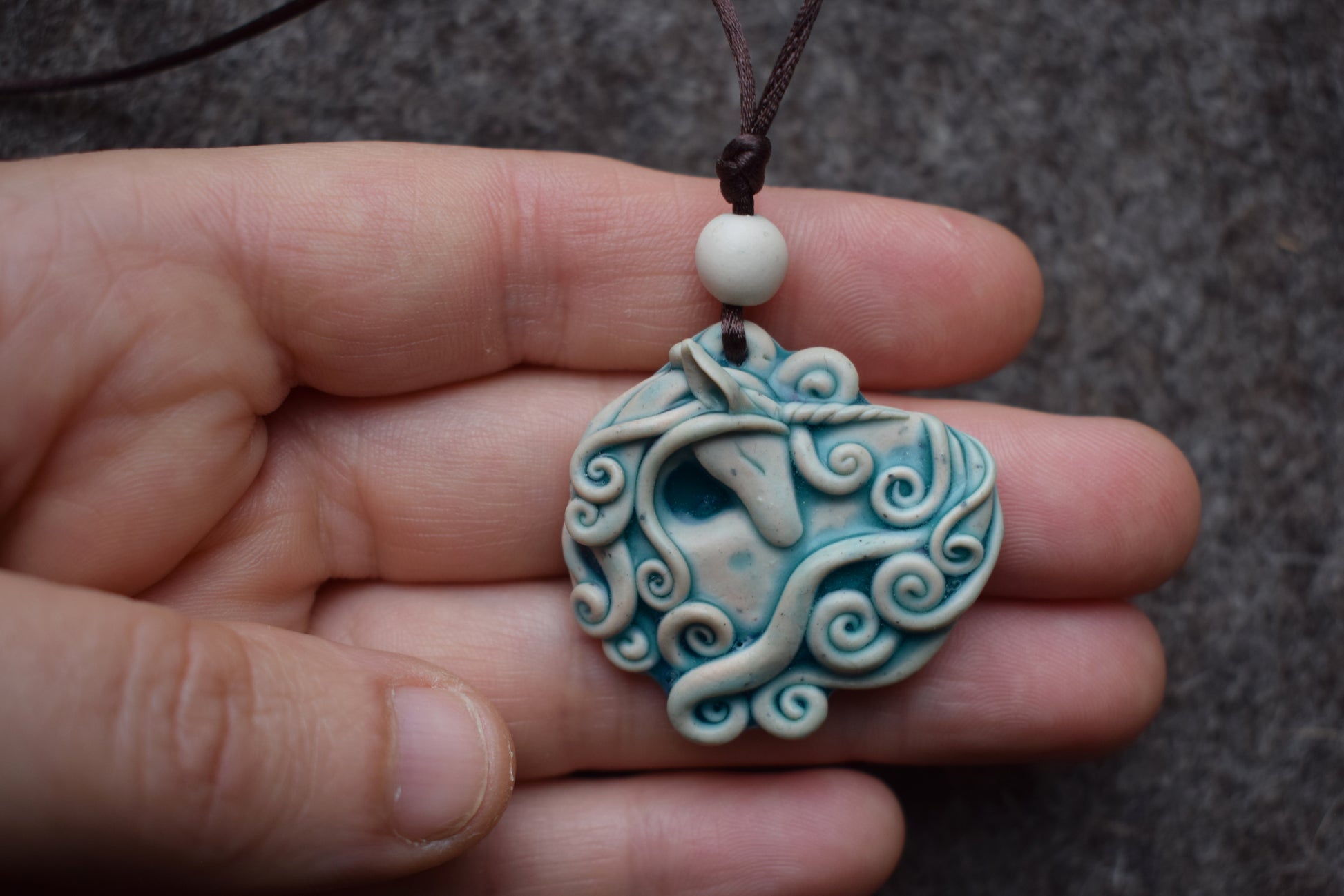 A hand-made unicorn pendant necklace sculpted from polymer clay. You will not get the exact one in the picture, but one very similar, with small differences due to being handmade.